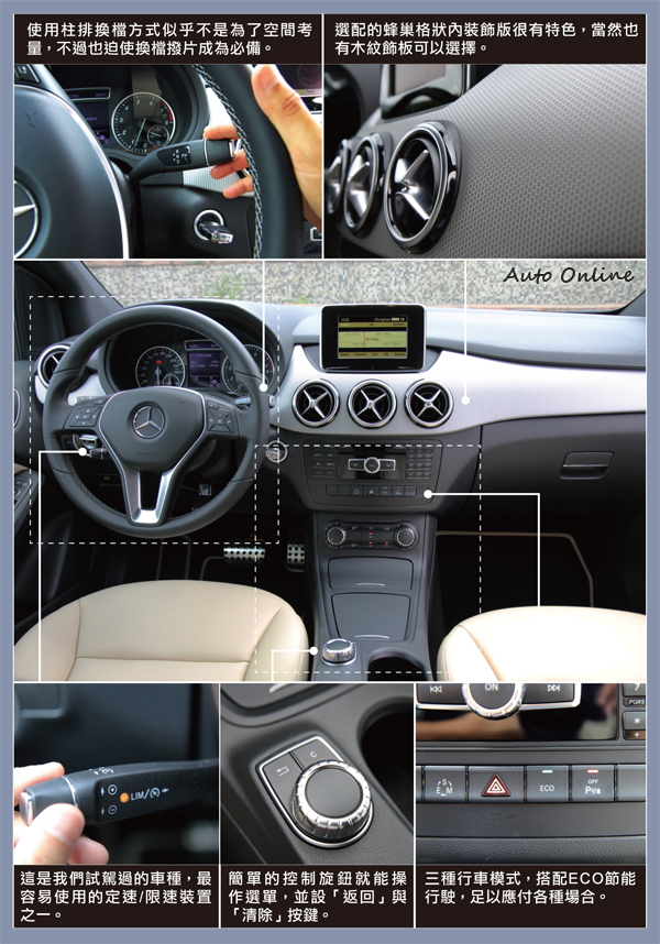 ![]() 關於B-Class的車型等級差異,除了動力之外,配備落差往往是買家們最在乎的。不過從規配表可以清楚看到,B180不如B200及B200 CDI的地方,就是採用舒適型懸吊、16吋輪圈和一些外觀配件上的差異,缺少的是電動天窗、直效操控動力方向盤、跑車化內裝套件、座椅電動調整功能和飾板、頂篷與音響等級不同外,其餘完全相同,甚至像ECO Start/Stop引擎怠速節能啟閉功能、方向盤換檔裝置、Artico人造皮椅、恆溫自動空調和藍芽電話免持聽筒功能,這些都被列為標配項目,而與安全有關的所有配備更沒有一絲一毫的縮水。所以認真來講,B180還是保留了一定水準的豪華配備,並沒有想像中那樣陽春。 ![]() ▲B-Class車體較諸前款矮胖,卻擁有勝過E-Class的後座頭部空間。![]() ▲雖然沒有中文選單,這組5.8吋螢幕操作反應不錯,能夠提供的功能也令人滿意。
