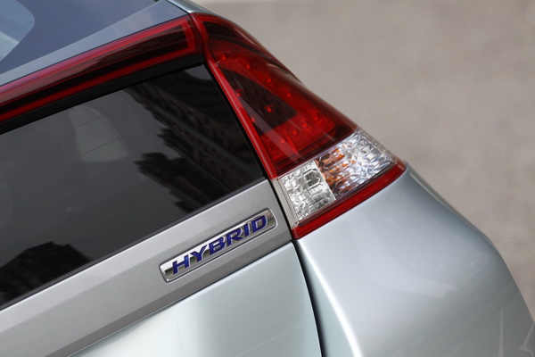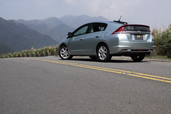 相同的後保桿在左右兩邊加上更立體的造型折角,姑且不談這折角對於空氣力學有何幫助,但是在視覺上確實讓Insight更加霸氣。後車尾門上改良型的薄型尾翼,這尾翼跟前水箱護罩上的藍色邊條有相同的設計出發點,看似像第三煞車燈,但其實它並不會發光。在牌照旁也增加銀色牌照框飾板,讓INSIGHT可以發揮日式精緻的視覺饗宴。三角形的特殊造型尾燈以LED光源設計,2012年式Insight以燈殼燻黑處理加入年輕的運動化元素。