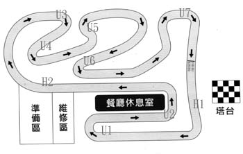 ▲賽道圖,H代表高速道,一出彎就要全油門到底,U代表U形彎道,容易Spin。