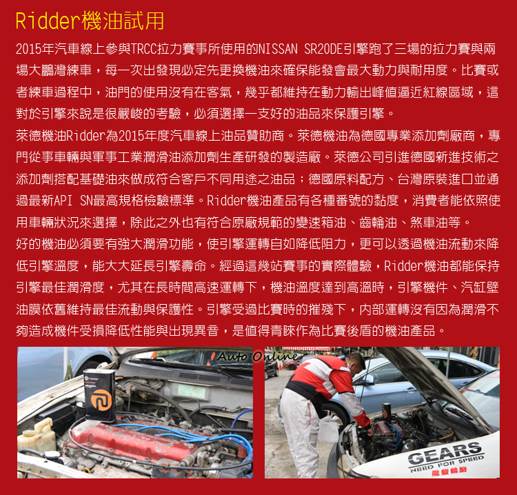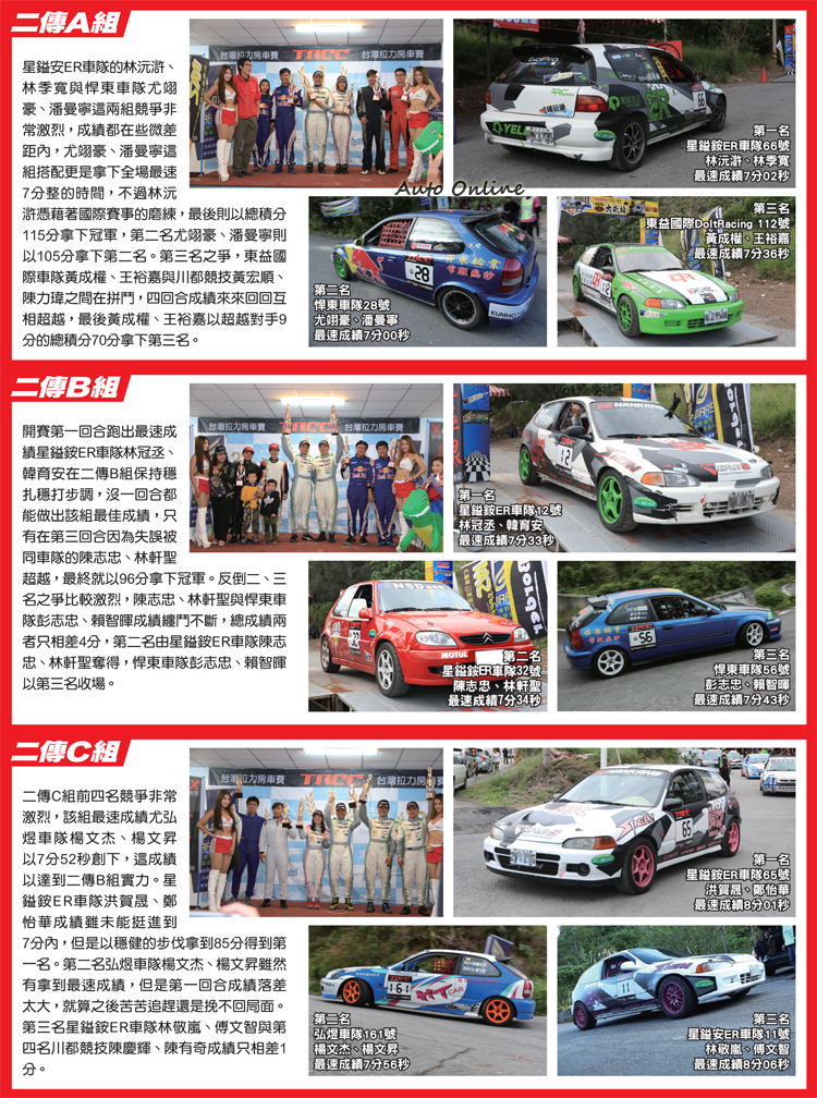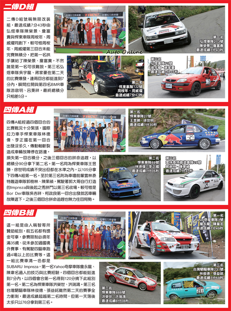 強大的後盾雲林泰特趣遊車隊![]() ▲雲林泰特趣遊車隊是汽車線上強而有力的拉力賽後盾。要在比賽中拿下好的成績除了車手技術之外,還要有車輛、後勤等完美配合才有辦法做到,2015年汽車線上參加了三站的TRCC,由於汽車媒體工作繁重,並未以汽車線上車隊名義參賽,而是靠行雲林泰特趣遊車隊來減輕賽事手續等瑣碎事情。雲林泰特趣遊車隊有如大家庭分工細膩,車隊中有雲林泰後勤技術支援,車隊長、車隊經理幫忙大家安排所有比賽會碰到的事情,參賽選手中還有前輩郭樹林大哥能指導技術,車手在無後顧之憂環境下專心比賽。 ![]() ▲車手除了技術之外,後勤也攸關比賽成績。![]() ▲SS4滑出道路撞壞了279號比賽車。![]() ▲沒關係!車修一修明年賽事繼續在戰!