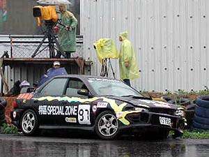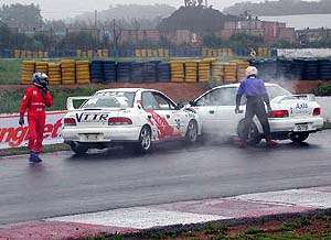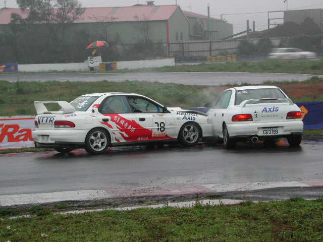 C組測時賽![]() ▲C組撞車啦!車手心痛不已。C組測時賽,威通車隊39號詹景順以1分13秒564取得P.P.,比A、B組連lash;多車手還快,如無重大失誤,站上頒獎台應不成問題。特區車隊呂東昇以1分14秒954位居第二,但是在測時賽中因車速過快,進入耶穌彎時滑出上牆,車輛損毀嚴重無法參加下午決賽。蘭陽鎮東車隊林世鐘以1分15秒179居第三位,順意車隊張凱偉以1分15秒553位居第四。
