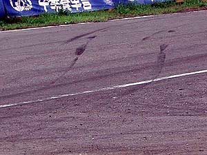 ▲洪欽煌在出S彎時SPIN,差點撞上彎道內側護強,現場留下清晰的煞車痕。<點