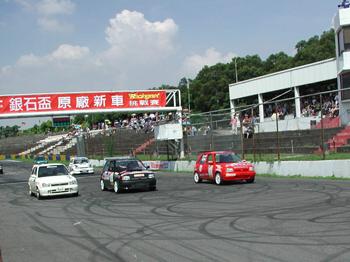 ![]() 進行決賽前的暖胎圈時,排首位的89號宏冠車隊陳世傑,車子突然出狀況,在跑到中S型彎道故障,引擎熄火無法再啟動,車子滑向跑道外側宣佈退賽,冠軍呼聲最高的車手就此含恨畢業,相當可惜,當然其他車手則是高興在心中阿。