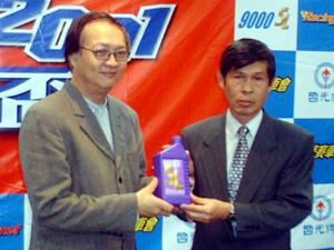 ▲中油 劉副執行長 永能先生將本次賽會指定用機油「中油新品SL機油」贈于中華賽車會楊會長