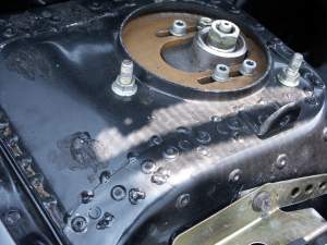 ![]() ▲全車的點銲相當完整,這也是廠車的必備條件車身剛性同樣是全車點銲加鉚釘,而且節點更多更密,經過噴砂處理過後的鋼板變薄,這些都是必要的程序。輕量化本來就是每輛賽車最基本的改裝,由於原廠硬皮鯊重1290kg,以一般2000cc的車來講已經偏輕(因此才會有偷料一說出現),而賽會規定是A組必須高於1080 kg,他們的作法是先盡量輕量化低於底線後,再按照需求配重。