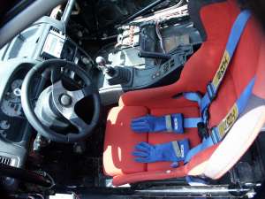 ![]() ▲除了電腦儀表以外,這輛B組車的內裝只看得到用來配重的電瓶,其餘並沒有太大改變它的變速箱還是使用原廠的(因為不得改裝),所以底盤設定的優劣就能看出各家的功力了。這輛B組賽車換裝日本Akebono所成立的另一品牌的AXIS出品的R2競技用煞車來令片和碟盤,前後避震器是採用Toda Fightex魚眼上座樣式,這套避震器比較特別的是具有後傾角可調的功能,而且它的氮氣輔助氣筒除了附身在避震主體本身之外,還有管路延伸到車上的外加氣筒,在調校的時候很方便。