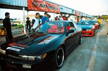 ![]() 2002年12月15日,天氣晴朗的好日子,TIS龍潭賽車場久違的觀眾?又湧進這令人期待的觀眾台上昂首期待,期待的就是傳說中的「甩尾天王—土屋圭市」,直到下午四點半多,亮麗的車隊終於在眾所矚目的期待下緩緩進場,在簡短的隊員介紹後,隨即開始懾人的極限操作,在連續近一個半小時的激烈磨耗下,我們不驚訝異的是,是哪個牌子的輪胎竟能承受如此的考驗,彷彿不知得花多少錢的投資,才能得到像這樣一條在極限運動下還能堅持操作性能的輪胎。