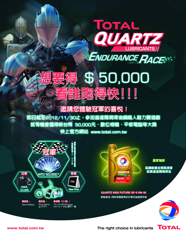 最後,TOTAL極力推廣環保節能概念,專為QUARTZ 9000 FUTURE GF5 5W30設計一套遊戲程式,並於網路上舉行競賽活動 – Iron Man Game 鋼鐵人耐力賽,且提供高額獎金及優渥獎品,歡迎來挑戰!最高獎金 新台幣五萬元,另有I-Pad、知名品牌數位相機等好禮活動詳情請洽TOTAL官方網站 WWW.TOTAL.COM.TW