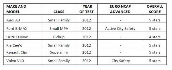 歐洲新車安全協會EURO NCAP公布了六部最近進行安全測試車款的成績,這六部車款包括AUDI A3、FORD B-MAX、ISUZU D-Max、KIA Cee`d、RENAULT Clio與VOLVO V40。六車的測試成績皆告捷,除了IZUSU D-Max整體成績是四顆星外,其他五車皆獲得五顆星評價。