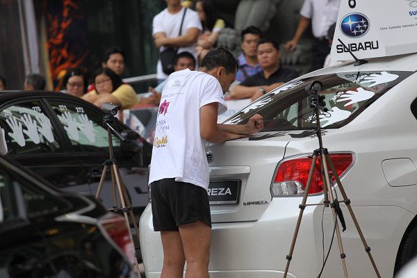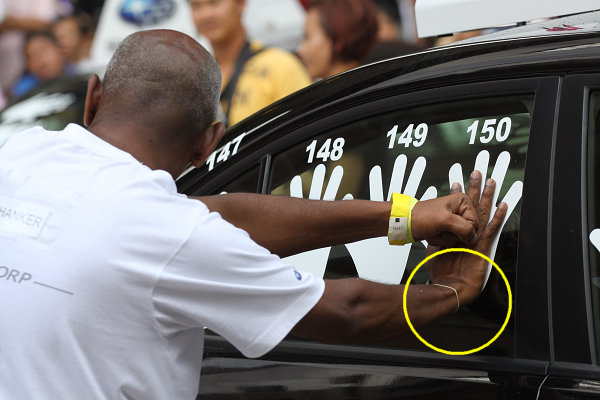 由於主辦單位發現Jaishanker手掌下半部滑出規定範圍,認定失去比賽資格,因此判定總冠軍為42歲的Gan Yu Shen。Gan Yu Shen在最後階段和其他選手一樣,離場時腿部也出現嚴重腫脹而行走困難,不過難掩獲得冠軍的喜悅。 ![]() ▲冠軍得主Gan Yu Shen的位置在車尾平面上,較具優勢,策略為以全身力量壓住手掌避免移位。![]() ▲亞軍得主Jaishanker抽中側窗玻璃的位置,運氣較差,在最後階段也因為攝影鏡頭證明他的手掌不自覺下滑而與冠軍擦身而過。