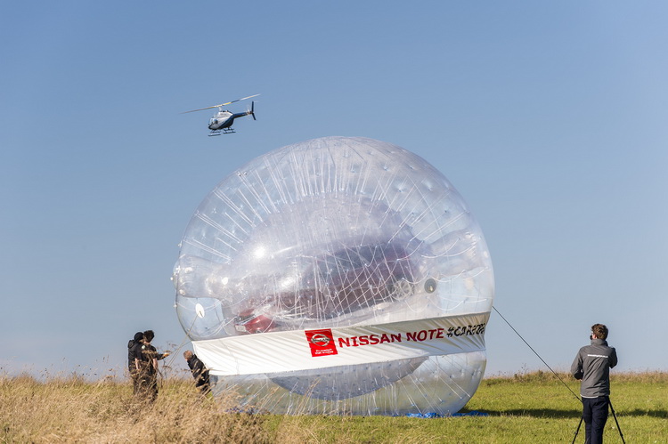 車廠所使用的超大泡泡球直徑達六公尺,圓周超過十八公尺,弄出這麼大的泡泡球當然不只是為了好玩,而是為了宣傳旗下人氣家庭小車Note的安全防護科技。在 http://youtu.be/sHLkF72nv9g這段影片中,被稱為CarZorb的大泡泡球就成功地一路滾下斜坡並保護車輛不受損傷。