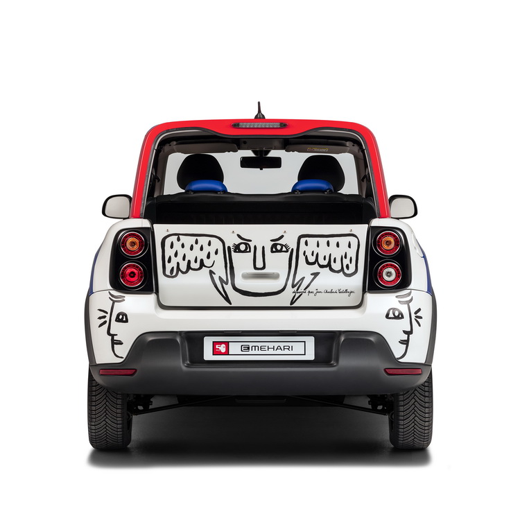CITROEN市場與行銷總監Arnaud Belloni表示,MEHARI是CITROEN的象徵性車款,也是最能代表追求自由,不墨守成規的車,五十年來不斷與法國流行文化結合而形成風潮。所以我們特別請到Jean-Charles de Castelbajac來為MEHARI的電動版後繼者E-MEHARI創作藝術彩繪車。也象徵這樣的精神將繼續傳承下去。