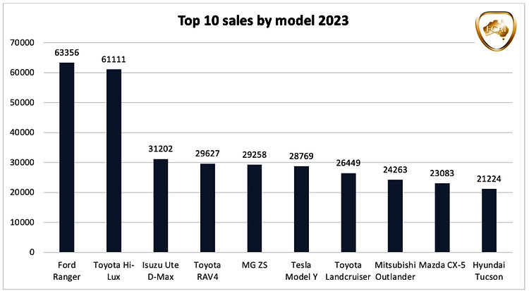 ![]() ▲Subaru BRZ成為去年澳洲最暢銷跑車,最新BRZ tS運動版本車型即將在當地上市。2023年是澳洲新車銷售量有史以來最高的年度,掛牌量高達121萬6780輛,純電車的市占率為7.2%。至於爭奪年度銷售冠軍車的戰場則是相當激烈,Ford Ranger和Toyota Hilux兩車款在銷售榜上的纏鬥,直到年底才終於分出勝負,最後Ranger以63,356輛的成績,成功擊敗已經連續蟬聯七次年度銷售冠軍Hilux(61,111輛),成為澳洲去年最暢銷車款。 ![]() ▲(The chart courtesy of FCAI)