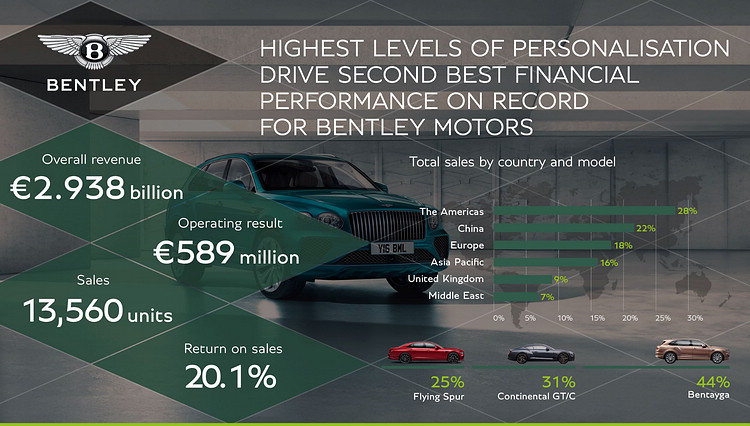 英國超豪華品牌Bentley汽車公佈全球財務業績,以營業利潤5.89億歐元及20.1%的銷售回報率,締造該公司史上第二高的紀錄,Bentley認為高階車型的行銷策略,以及品牌提供的豐富個人化客製服務和限量版車型的推出,是助長銷售的最大功臣。