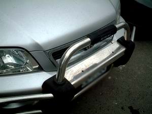 ▲在國內也相當流行的車頭防撞架,在一些四驅車以及客貨車上尤其流行,不過高度恰好與孩童頭部相當的鋼管,一旦發生車禍,往往釀成慘禍與國內情況相同,香港有許多休旅車以及客貨車以為車頭裝上鋼管防撞架就可以增加防護作用,但事實上正好相反。由於不像傳統越野車,一般以轎車標準做基礎設計的休旅車以及客貨車,目前都必須(且被強制規定)以前保險桿的潰縮特性作為緩衝衝擊能量直接傳達至車艙的設計,但如果車主私自在保險桿前加裝防撞架,則會使得原有的吸震設計完全失效,而且遭受嚴重撞擊時,防撞架會因為較脆弱的車體固定處不堪衝力扯裂後,讓斷裂的防撞架倒插車內,對車內人員造成致命危險。