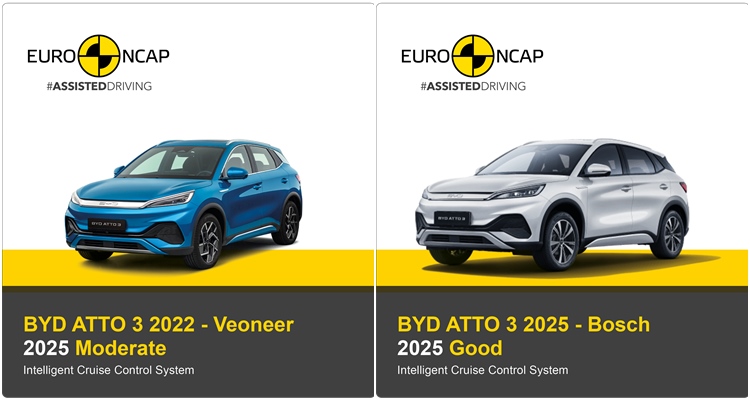 2024年10月,Euro NCAP曾向消費者發出警告,指出比亞迪(BYD)ATTO 3所搭載的智能輔助駕駛系統存在嚴重缺陷,還史無前例地給了「不推薦」(Not Recommended)的評價。為了解決這個問題,比亞迪聲稱已經為舊年式的車款進行OTA軟體更新,並且自2025年式起,新車改搭可以滿足Euro NCAP「良好」等級的輔助駕駛系統。
