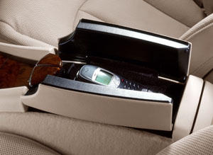 ▲在選配有原廠車用行動電話系統的車款上,中央扶手置物盒採用獨特的左右對開式設計,盒蓋開啟後會露出裡面以鎂合金材質為框架的高質感手機放置空間。