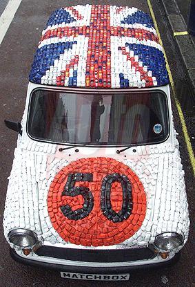 ![]() MATCHBOX公司的作法,是將上百輛的玩具小車,裝飾一台ROVER MINI,且運用不同的配色,在車頂組合一副英國國旗,引擎蓋部分是用紅、白、黑三色組合出紅底黑字的50字樣,以強調女皇登基五十週年的主題。該車將在英國各大城市的百貨商場,與各項慶祝登基有關的商品共同展出。