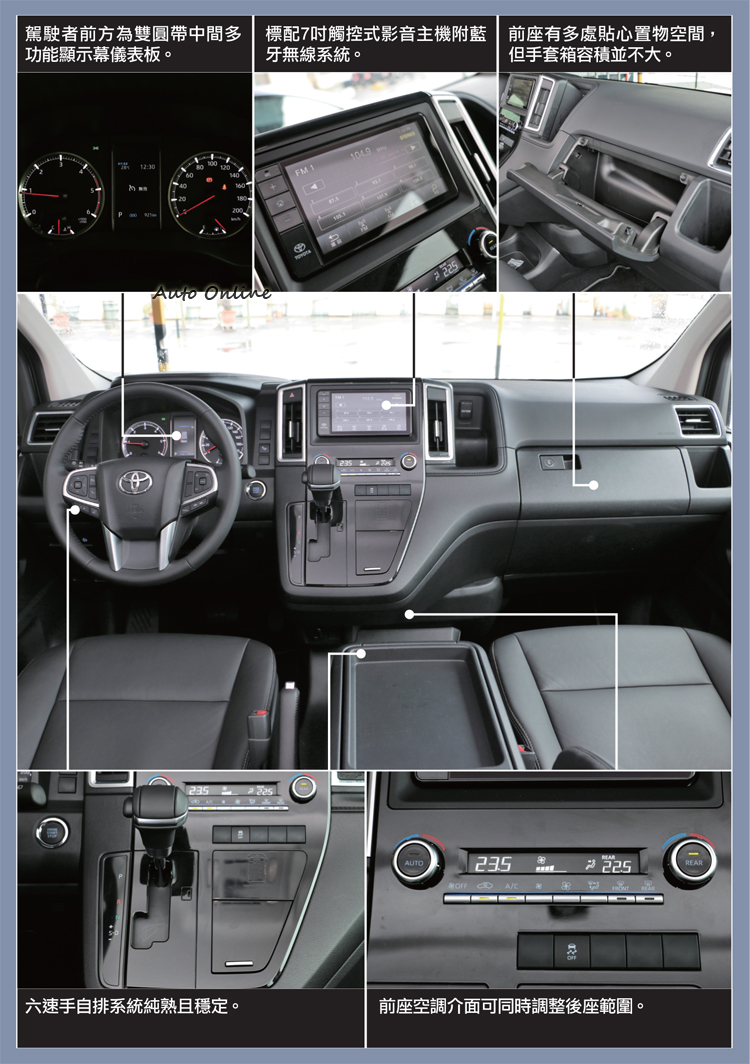 ![]() 駕駛者介面與大多數Toyota車系相同,用料不是最頂級卻也不會顯得寒酸,基本的功能一應俱全。中控台標配7吋觸控式影音主機附藍牙無線系統,方便於行駛中免持聽筒即可接聽電話。 ![]() ▲前後雙區恆溫獨立空調,後座有獨立控制介面,可從前座或者後座自行調整。