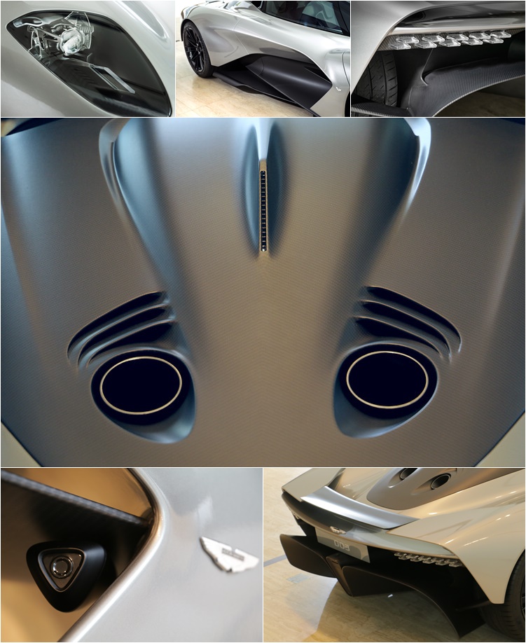 晉身天堂的新境界Valhalla全車利用碳纖維工法打造,以完成輕量化極致車身,頭尾燈四個燈組相加之總重,甚至小於DB11一顆頭燈之重量。對於車重的嚴格追求,讓整體車身重量保持在1,350 kg以內,並採用中置引擎設定,力求完美配重,成就馬力重量比750hp/tonne的亮眼數字。