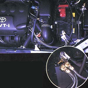 負極接地線就是疏通下游電路的秘方,所有接點都是低電阻、抗氧化的鍍金接頭,比照高級音響訊號線辦理!導線部分為軟銅材質編織成形,能承受大電流並抵抗拉扯、彎曲,雖然沒出現發燒音響等級的OFC長結晶銅,但沒有車主希望自己的愛車也「發燒」吧!所有的配縣市經過計算的,接點位置需要承受較高電流者必須加粗直徑,接頭接觸面積也要大才有整體效果。