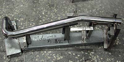 ▲這就是排氣頭段的「模子」,包括彎管弧度、含氧感知器位置、支腳位置、頭尾墊片位置等等,手工生產排氣管都需要如此按模加工。