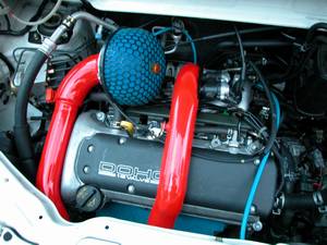 為考量到Turbo作動時所需要的油量,因此tuner便自行燒製管路,於節氣門後追加三支250c.c.噴油嘴來對應高轉速域的供油量(目前僅兩支作動,另外一支則為日後打高增壓預備);進氣系統的提升上同樣以自製加大管路方式將原廠儲氣盒取消改為Simota品牌香菇頭,讓增壓時可提供足夠的吸氣量;而在Intercooler加裝方面,由於水箱與保桿內鐵間並沒有多餘的空間,因此tuner採取將內鐵外移方式塞入小型中央冷卻器。洩壓閥的選擇上,tuner則選擇Blitz廠製品,不過因應車主個人的喜好,洩壓閥的位置則更改至水箱護罩前並更改管路角度,以讓收油門時的「音爆」聲完全釋放,突顯此車的稀有性。