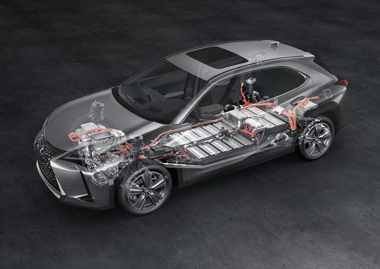 電動系統所使用的大電量鋰電池配置於車室地板之下,蓄電容量達54.3kWh。LEXUS長期以來從油電車開發所累積的馬達、變流器、變速系統、電池等技術讓這套電動驅動系統有著很高的運作效率,充飽一次電可以有400公里的續航里程。電池內部的溫度調整機能也能確保電池在低溫或高溫環境下正常運作。加上過充防止系統、多重監測的安全機制之下,具有高度的耐用度與可靠性。