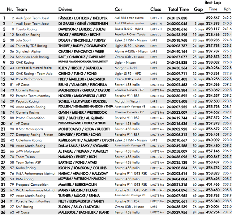 整個24小時的比賽過程中,有大半場是分別由PORSCHE和AUDI處於領先,但比賽直到進入最後2小時開始出現高潮!隨著兩輛PORSCHE和1輛AUDI因機械故障而必須進站搶修,讓LMP1前面幾輛車的排名重新洗牌,幸好AUDI及時讓2號車回到場上,加上先前所累積的領先圈數,沒有讓後面速度更快的TOYOTA超前,因而保住第二名。