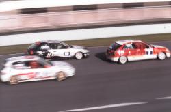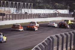 ![]() ▲亞洲房車賽採用D1與D2組混合進行比賽,場面相當壯觀。跑道外的緩衝區很大,地面滿佈黑色的軟煤塊,沒有抓地力,照理說不會翻車。但是車速過快,衝到一條橫向大斜溝,車子順勢翻了過去,但滾了一圈隨即翻正,還好引擎沒熄火,但是地面太軟以致車輪陷入動彈不得,只能含恨退賽。就這樣,亞軍也飛了。終場仇偉冠拿下冠軍。