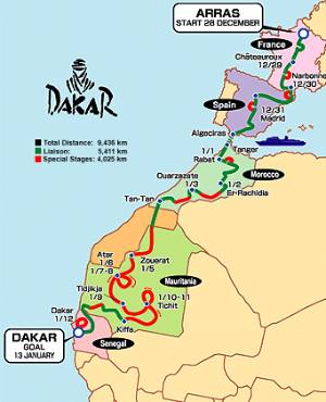 今年的達卡越野賽總里程數為九千四百多公里,要進行17天,自法國北部阿拉斯起跑,途經法國、西班牙,然後進入摩洛哥沙漠、茅利塔尼亞沙漠,最後一站為塞內加爾的達卡。衛冕冠軍的Kleinschmidt一開始就因為變速箱故障失去先機,搶修無效後乾脆只用兩輪驅動的方式繼續前進!