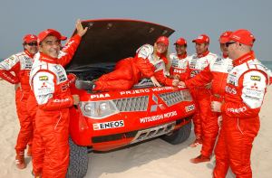 ![]() 車手陣容也隨新車規格一併宣布,除增岡浩尋求衛冕外,還有曾六度贏得達卡機車組冠軍的法國車手Stephane Peterhansel加入,他也是去年和增岡浩戰到最後一個賽段才意外敗北的參賽者,實力絕不在增岡浩之下。同時拿過兩次WRC總冠軍的Miki Biasion也是成員之一,他們都將駕駛Pajero Evolution出賽,陣中還有位女性車手Andrea Meyer也駕駛Pajero一同赴賽。