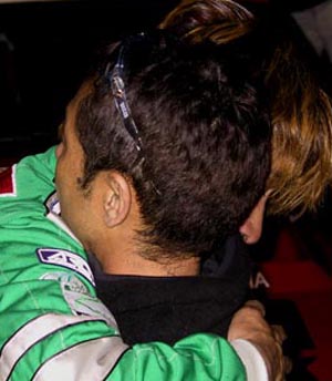 ![]() ▲風間靖幸在頒獎儀式中灑下英雄淚,與恩師土屋相擁而泣。最後評審決定再度加賽。在這回合中,風間略勝一籌,滑行動作完美無缺,相對地持續搶攻的谷口似乎變得很急躁,兩車衝線距離仍相當貼近。此時現場開始鼓譟,兩車緩慢駛向觀眾席前,大會主審土屋圭市亦步上兩選手前宣佈戰績,當土屋唸出風間靖幸為本屆冠軍後,風間幾乎不敢相信自己耳朵,錯愕表情與泉湧淚水,詮釋跨入甩尾競技的辛酸歷程,緊擁著土屋這位恩師,2004年北美站甩尾冠軍風間靖幸,拿下他第一座冠軍獎盃,為今年度美國D1甩尾大賽劃下完美句點。