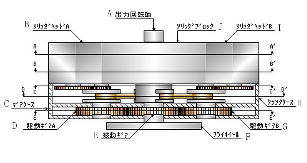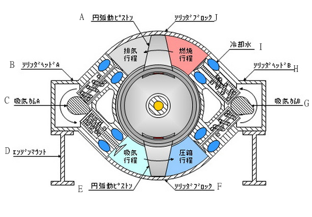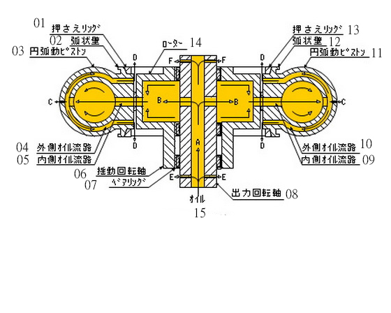 ![]() ▲A:活塞環滑槽、B:扣環、C:轉子、D:活塞滑槽、E弧狀壁、F:活塞環滑槽、G:活塞 、H:搖動迴轉臂、I:搖動迴轉軸、J:轉子滑槽、K:轉子滑槽、L:活塞滑槽、M :弧狀壁、N:活塞圓弧運動引擎是結合了現在一般車輛採用的往復式引擎與具有輕量體積小大馬力輸出之轉子引擎二者的優點,以嶄新的靈感所創造出的新結構內燃機引擎。在如甜甜圈狀的汽缸之內,活塞以甜甜圈狀的中心為起點以圓弧的路線進行往復運動,汽缸內並配置了四個燃燒室,將往復式引擎與轉子引擎的特點巧妙地融合在一起。 ![]() ▲01:扣環、02:弧狀壁、03:活塞、04:外側機油流路、05:內側機油流路、06:推動迴轉軸、07:軸承、08:出力迴轉軸、09:內側機油流路、10:外側機油流路、11:活塞、12:弧狀璧、13:扣環、14:轉子、15:機油跟一般汽車使用的2.0升排氣量往復式引擎重量約200公斤左右相比,相同排氣量程度的圓弧運動引擎重量約可輕上15公斤左右,引擎更為小型與輕量化對於車輛整體的輕量化有所助益。更重要的是排氣量1000cc的圓弧運動引擎就可以提供相當於2000cc一般引擎的動力輸出,油耗最多也可節省三分之一左右。 ![]() ▲A:出力迴轉軸、B:汽缸頭A、C:變速箱外殼、D:驅動齒輪A、E:被動齒輪、F:飛輪、G:驅動齒輪A、H;變速箱外殼、I:汽缸頭B、J:汽缸本體![]() ▲A:活塞、B:汽缸頭A、C:進氣凸輪軸A、D:引擎腳座、E:活塞、F:汽缸本體、G:進氣凸輪軸B、H:汽缸頭A、I:冷卻水、J:汽缸本體