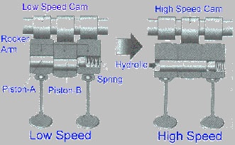 既然我們知道低角度、揚程的凸輪利於低速運轉,高角度、揚程的凸輪利於高速運轉,那設計一套可切換凸輪的系統不就好了。沒錯,世界上就是有這種產品,那就是HONDA的VTEC。﹙MITSUBISHI MIVEC也是﹚