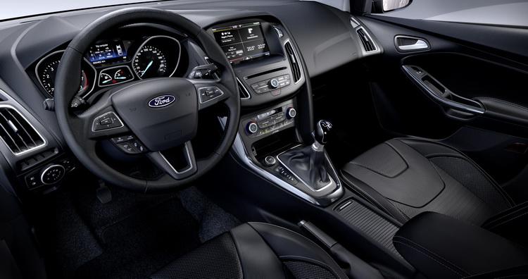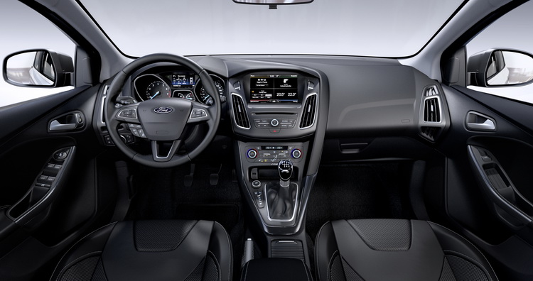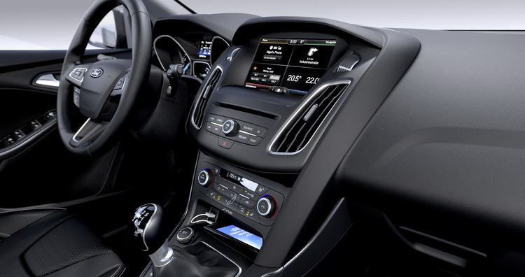 內裝部分的改變聽從了老車主的意見,將駕駛介面變得更為直覺,將方向盤與黑色中控台上的按鈕控鍵精簡化,並加入鍍鉻的細部裝飾,讓整個中控台看起來更清爽也更摩登。前座中央有了新的滑移式扶手,下方的置物槽可以收納1公升的飲料瓶與400cc的杯子;更厚的地毯、車窗玻璃與引擎室防火牆在乘坐時也提供更好的隔音效果。新Focus歐規車型也將率先搭載福特最新的SYNC 2影音娛樂通訊系統,包含了8吋高解析度觸控螢幕與更先進的聲控系統,讓駕駛者更輕易地操作音響、導航、空調與行動電話。