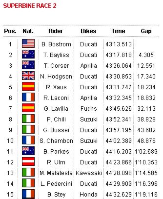 C.Edward的戰馬到了第二場時似乎狀況不佳,因此在第一圈時已經落於B.Bstrom、T.Corser、Bayliss之後,雖然C.Edwards在比賽中段之後急起直追,甚至一度與領先的B.Borstrom展開纏鬥,不過最後仍然因為機械故障而慘遭退賽的命運。相反地B.Bostorm在這一場比賽中,一直維持穩定的水準,沒有讓後方的Bayliss、T.Corser等人超越雷池一步,終於為自己拿下了個人Superbike生涯中的首度分站賽事冠軍。兩位澳洲車手T.Bayliss與T.Corser則又和上一場同樣分別拿下二、三名,看來Kyalami果然還是美國與澳洲車手的天下。