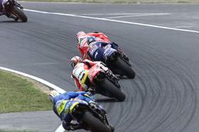 ![]() 比賽在起跑之後,長長的車陣緊密地連接在一起,最前方由L.Capirossi帶領,G.McCoy、M.Biaggi、中野真矢等8位車手勉強算是第一集團,彼此之間不斷超越互換順位,至於V.Rossi則因為起跑不佳,一時陷入第七、八位左右的位置;不過V.Rossi卻在前幾圈的潛伏之後開始發威,連續加速超越數位前方車手,直接爬到前三、四位左右,開始與Biaggi進行近身追逐,G.McCoy則已將速度不斷下滑的L.Capirossi超越,暫時取得領先位置。