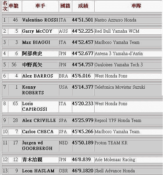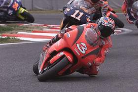 ![]() 這場比賽中運氣不佳的不只有宇川徹,剛從Superbike轉換跑道過來的日本車手芳賀紀行,在開跑前幾圈還相當地勇猛,但卻在第十圈時就早早側滑轉倒出去;和中野一同轉戰500cc組的O.Jacque,也因為車子發生機械故障,而隨後在第十一圈回到PIT,退出了比賽。