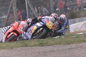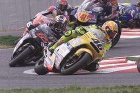 ![]() V.Rossi與M.Biaggi兩位騎乘風格強悍的義大利車手在相遇之後,立即展開一陣廝殺,Biaggi甚至在一個彎道出彎加速時將V.Rossi「彆」到道路外側沙石地上,差點讓V.Rossi出局;不過,薑是「小」的辣!V.Rossi在稍稍減速之後隨即跟上、繼續纏鬥,並在數圈之後將老大哥Biaggi超越(超越時Rossi還回頭向Biaggi揮手致意,夠嗆),步調繼續加快,最後超越G.mcCoy,取得領先位置。