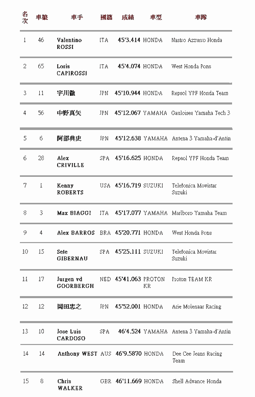 V.Rossi在這一場比賽拿到了GP500生涯的第一個杆位,不過在
