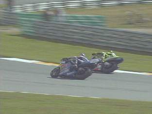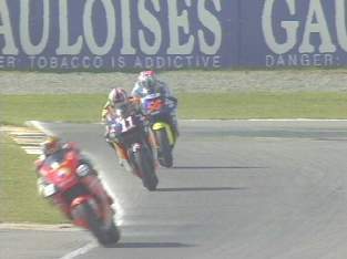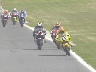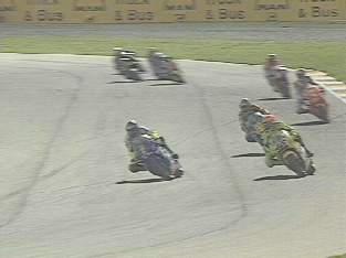 在前面幾圈之中,領先集團的幾位車手K.Roberts、V.Rossi、Capirossi、G.McCoy等人互相超越,彼此的順位也頻頻變換,不過一直到第六圈時,