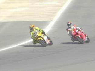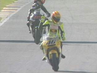 三人形成日本車手大對決,宇川徹則維持在這個集團的領先位置;在第一集團方面,雖然Capirossi從頭到尾都沒有放鬆,緊迫著V.Rossi不放,不過V.Rossi的速度和跑線節奏並沒有因此而受到影響、發生失誤,終於在28圈的奮戰之後,