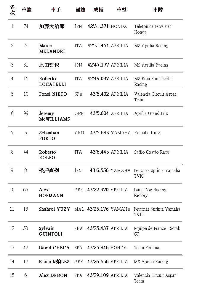 雖然加藤拿下了這場比賽的杆位,不過在起跑時M.Melandri倒是相當積極,搶得領先位置,加上原田哲也從後方進逼,加藤一時腹背受敵,而Locatelli等APRILIA車手也緊守在後方,領先集團內仍是呈現相當緊繃的態勢。