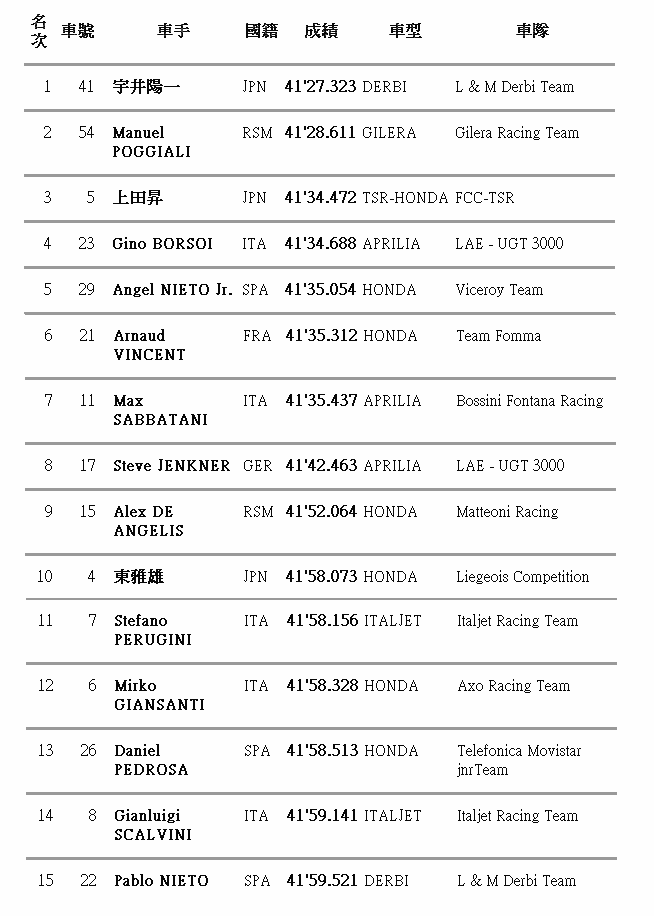宇井陽一在這一站的狀況可以說是相當不錯,自杆位排位起跑後,就一直保持著領先的位置,另外一位起跑表現不錯的黑馬車手則是排在第六位起跑的西班牙籍的Elias,不但在第一個彎之後就追到宇井的後面,而且兩人還一度與後方拉開一段距離,彷如冠亞軍的捉對廝殺一般。可惜,Elias的黑馬姿態,在第5圈被M.Poggiali超越之後就逐漸消失,順位隨著圈數的進行而逐漸向後退。