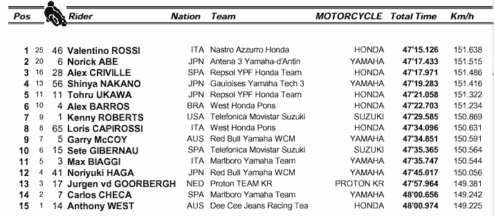 已經連勝2場的V.Rossi在來到西班牙後,仍然拿下了杆位,氣勢銳不可當;在比賽起跑之後,阿部典史倒是表現不錯,首先搶過第一個彎道;不過氣勢正旺的