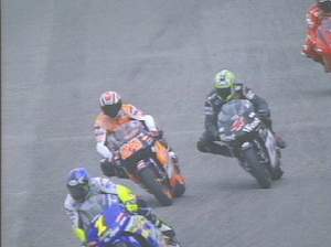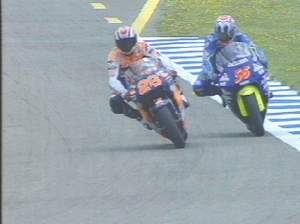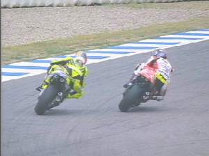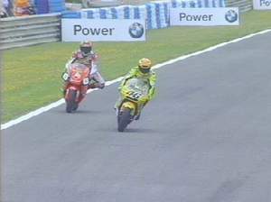 V.Rossi在第二個彎就馬上把領先位置給搶回,兩人之間的距離貼得很近,速度也越拉越快,也正開始與後面的集團拉開距離。