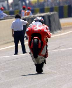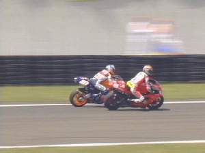 M.Biaggi難得以杆位的位置起跑,自然不會輕易放鬆,在緊盯了4圈之後,他立刻在一個直線底要入彎時找到一個機會,