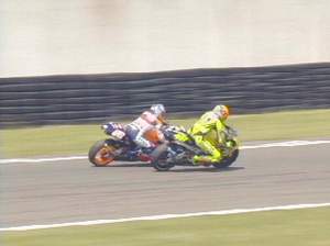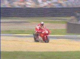 把K.Roberts給超掉。不過,M.Biaggi在佔上領先之位後顯得過於心急,因此在第7圈時發生了一個失誤,衝入減速彎道的沙石緩衝區「