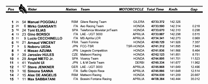 Borsoi←Poggialli←Giansanti←T.Elias←Cecchinello五位領先車手逐漸與後方拉開距離,但是彼此之間仍然是纏鬥不休。直到最後衝線之時,Poggialli守在領先位置,而五人最後是以不到1秒的超些微差距來判定勝負,Poggialli也非常幸運地在這場激鬥之中拿下了自己生平的第一場WGP分站冠軍。